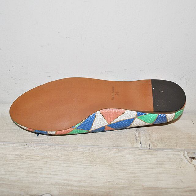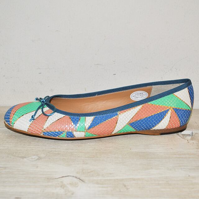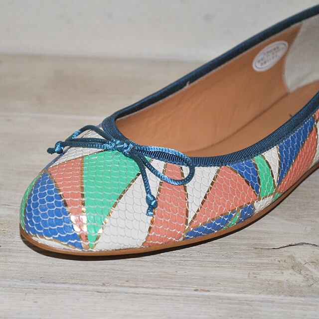 ボロネーゼ製法のフラットシューズ。包み込まれるような心地よい足入れが魅力の1足。マルチカラーが華やかなアイテムです。