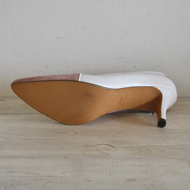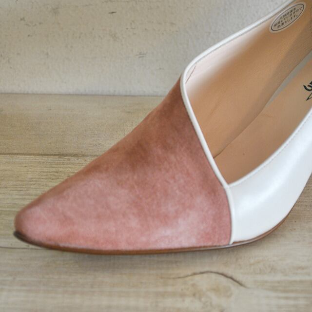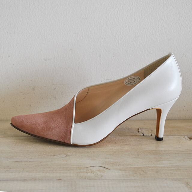 袋状の縫製が優しく足を包みこんでくれるボロネーゼ製法のパンプス。独特のカットラインとスエード×スムースのコンビが存在感あるタイプです。7cmヒールが脚をすっきりと見せてくれるので、スカートでもパンツでも合わせやすいです。ブーティーのように甲部分が隠れるデザインです。